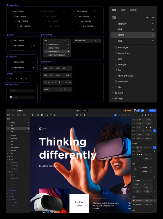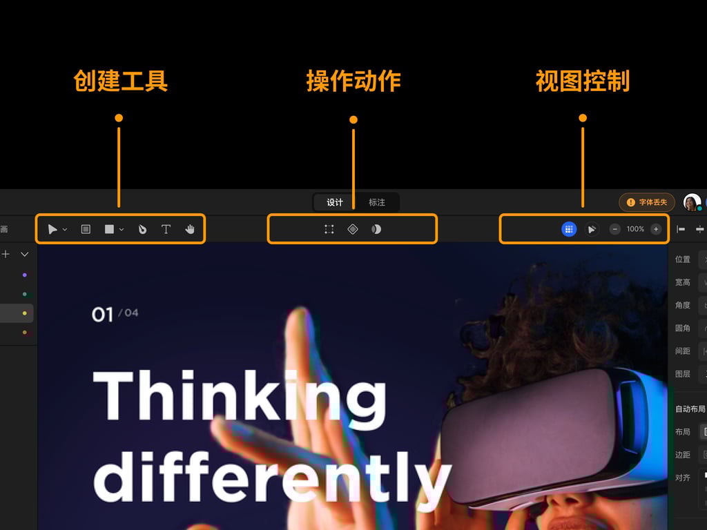 因为我们在切换模式时,下面的工具栏、图层栏和属性栏都有可能发生变化,所以从信息层级来看,顶部切换导致下面界面的变化才是合乎情理的,这就是信息层级的清晰。未来我们还会有原型等更多模式,我们也会把对应的功能都放到不同的模式下,这就是路径的清晰。